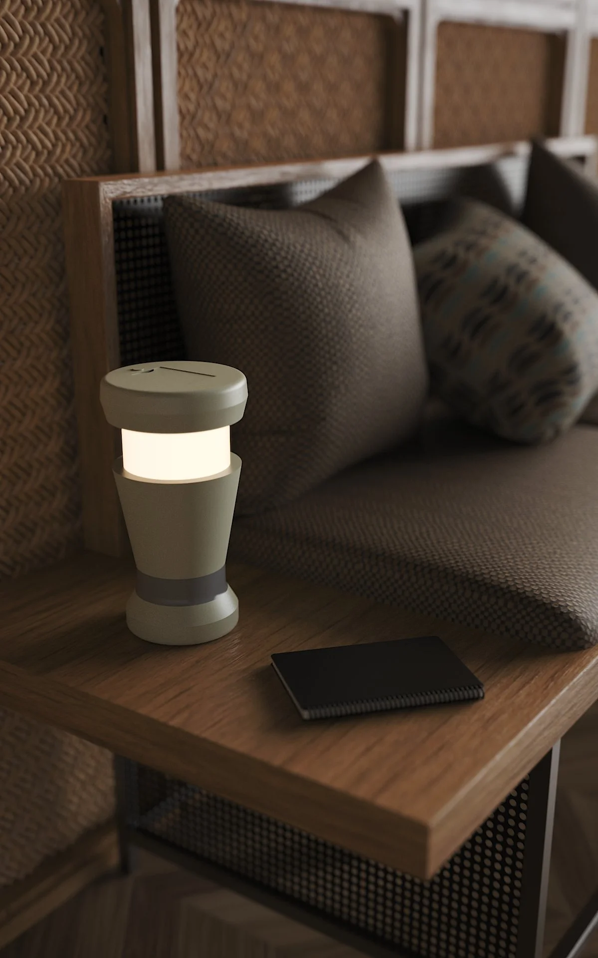 A work/bedside lamp that incorporates a modern yet rustic feel that provides customizable brightness control when turned on